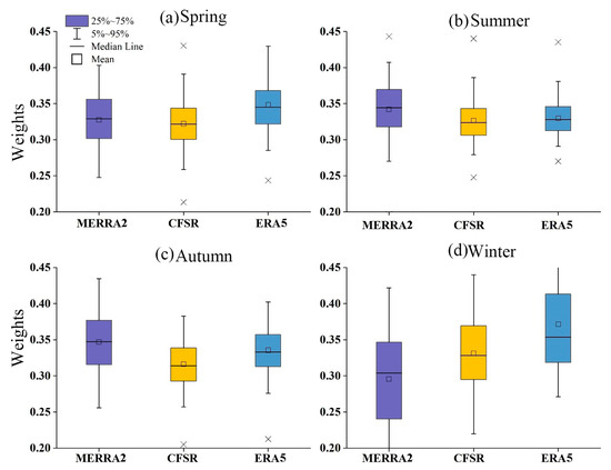 Box plot depicting the signal-to-noise ratio (SNR)-based weights across different seasons: (a) spring, (b) summer, (c) autumn, and (d) winter.