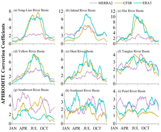 Daily rainfall correction coefficients for each product based on the daily scale of APHRODITE.