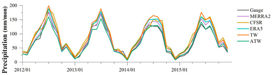 Monthly precipitation across mainland China from 2012 to 2015 for MERRA2, CFSR, ERA5, TW, and ATW.
