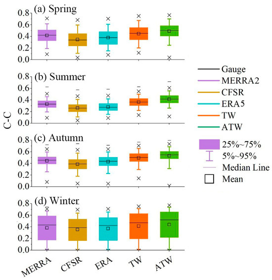 Correlation coefficient (C-C) for MERRA2, CFSR, ERA5, TW, and ATW across different seasons: (a) spring, (b) summer, (c) autumn, and (d) winter.