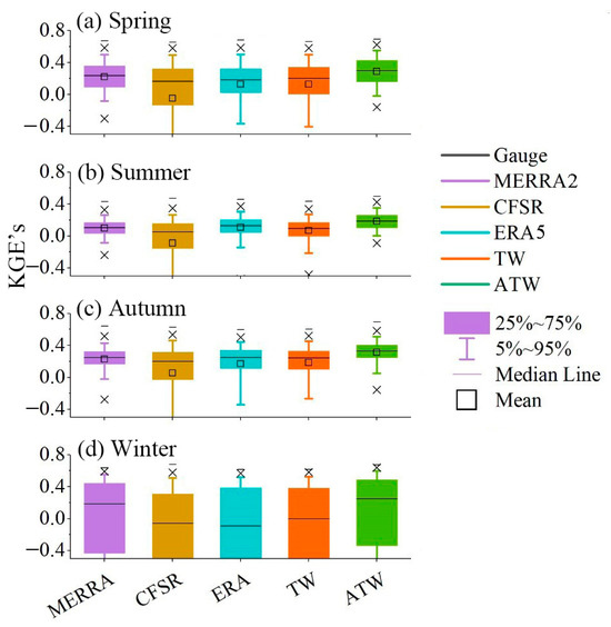 Kling–Gupta efficiency (KGE’) values for MERRA2, CFSR, ERA5, TW, and ATW across different seasons: (a) spring, (b) summer, (c) autumn, and (d) winter.