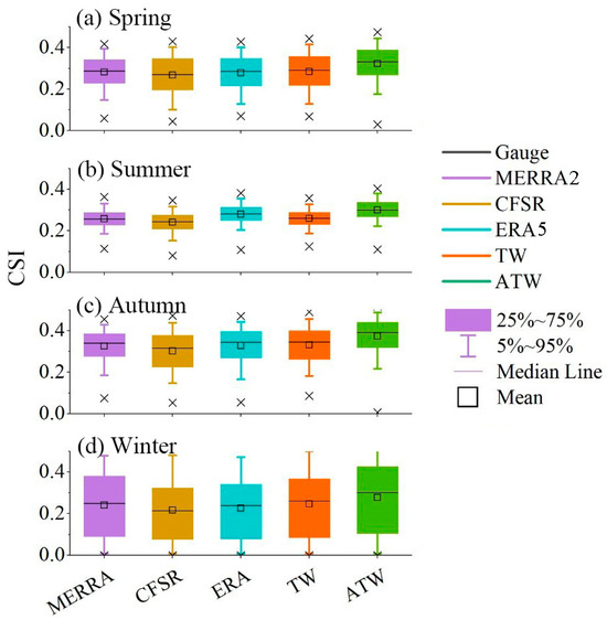 Critical success index (CSI) values for MERRA2, CFSR, ERA5, TW, and ATW across different seasons: (a) spring, (b) summer, (c) autumn, and (d) winter.