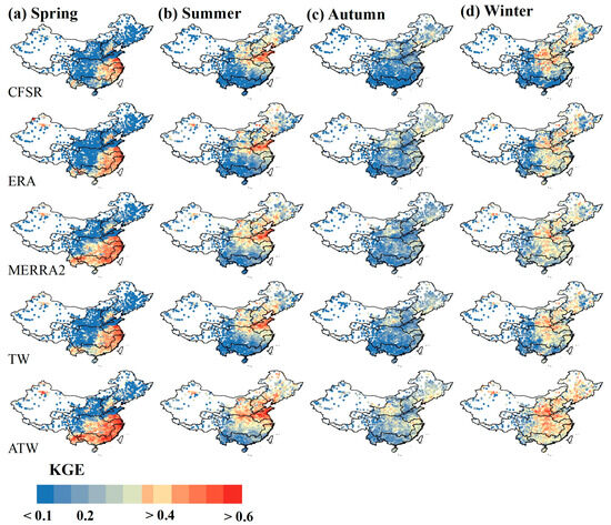 Spatial distribution of the Kling–Gupta efficiency (KGE) across different seasons: (a) spring, (b) summer, (c) autumn, and (d) winter. The products are arranged in the following order, from top to bottom: CFSR, ERA5, MERRA2, TW, and ATW.