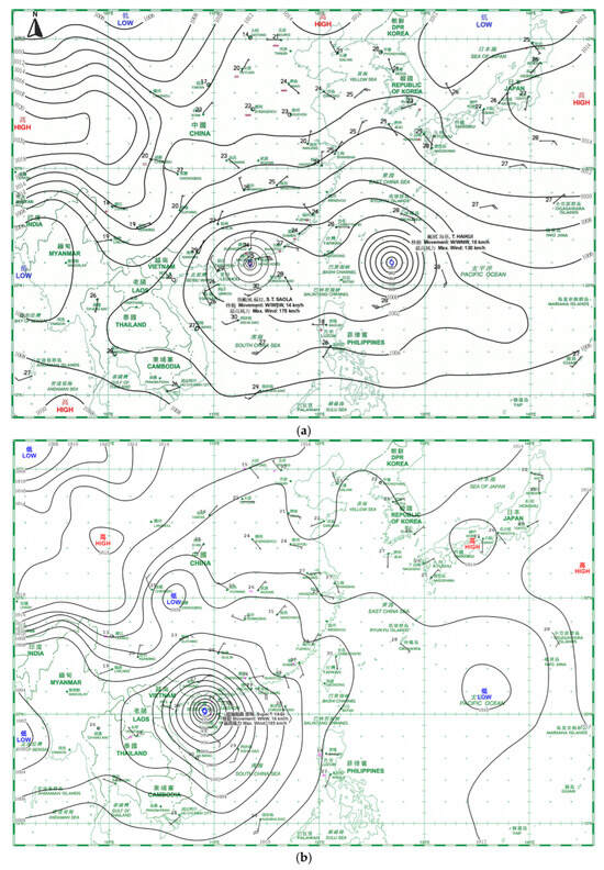 (a) The surface synoptic chart at 0200 Hong Kong time on 2 September 2023 and (b) the surface synoptic chart at 0200 Hong Kong time on 7 September 2024.
