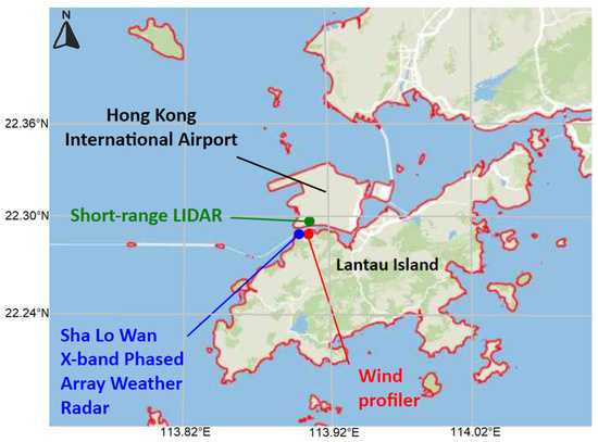 The locations of the X-band dual polarisation phased array weather radar (PAWR) and the wind profiler at Sha Lo Wan (SLW), as well as the short-range LIDAR at the Government Flying Service (GFS) headquarters at the Hong Kong International Airport (HKIA).