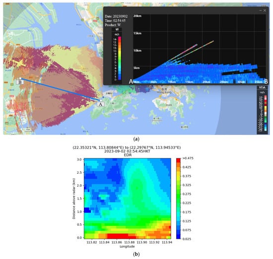 Simulation of RHI scans of (a) the EDR and (b) wind field from the RAMS on 18:54:10 UTC, 1 September 2023.