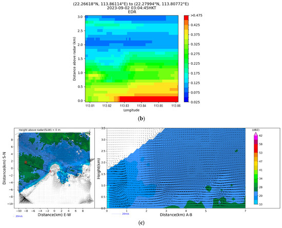 (a) The RHI spectral width scan and (b) the associated cross-section of the eddy dissipation rate (EDR) as well as (c) the three-dimensional wind fields (left: horizontal wind field at height of around 34 m above sea level. Right: wind field projected on the cross-sectional plane A–B on the left panel) obtained/retrieved using the SLW radar data at around 0255 Hong Kong time on 2 September 2023.