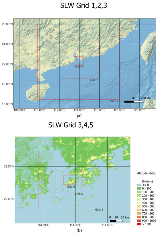 The latest version of the Regional Atmospheric Modelling System, namely RAMS 6.3, is used for this study (downloaded from https://vandenheever.atmos.colostate.edu/vdhpage/rams.php (accessed on 11 November 2024)). The RAMS solves the full set of primitive dynamical equations governing atmospheric motion, with additional parameterizations for processes such as turbulent diffusion. There is no lower limitation on its grid size and it has been used in the simulation of turbulent flow over complex terrains or small-scale weather events [10]. The model configurations are similar to those of Chan (2014) [14]. Five nested domains are used in the simulation. The initial and boundary conditions are obtained from a 0.25-degree hourly reanalysis of the European Centre of Medium Range Weather Forecast. The spatial resolution of the simulation is increased by a factor of five, namely 25 km, 5 km, 1 km, 200 m, and 40 m. The coarsest domain has a timestep of 10 s, with timestep ratios of 2, 2, 3, and 3 for subsequent domains. The first model level is about 30 m above sea surface. There is then a stretching ratio of 1.08 (i.e., the ratio of the model level heights between the adjacent model levels).