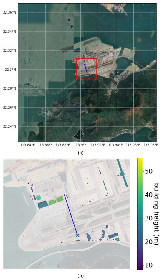 (a) The domain of the PALM simulation denoted by a red rectangle where the boundary is the 5th nested domain of the RAMS simulation. The blue line indicates the location of the RHI scan of the GFS LIDAR. (b) The PALM simulation domain with building heights indicated by the colour bar. The blue cross symbol indicates the location of the GFS LIDAR, and the blue line shows the location of its RHI scan.
