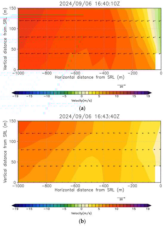 (a) The RAMS simulation for RHI scans of radial wind velocity from the GFS LIDAR at 16:40:10 UTC on 6 September 2024. (b) The RAMS simulation for RHI scans of radial wind velocity from the GFS LIDAR at 16:43:40 UTC on 6 September 2024.