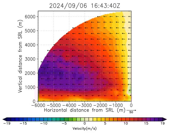 The second case was observed by the GFS LIDAR and was related to Super Typhoon Yagi in 2024. The observations were again made in the early morning in Hong Kong. The synoptic chart can be found in Figure 1b, namely in the early morning of 7 September 2024. Though Yagi was located at more than 400 km west–southwest of Hong Kong at that time, it was a very intense typhoon and still brought strong winds to the territory, and airflow disturbances still occurred at the HKIA.