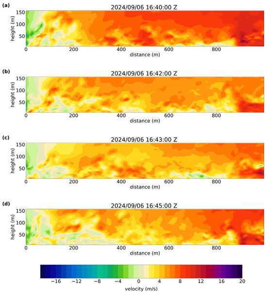 The PALM simulation for RHI scans of radial wind velocity from the GFS LIDAR at four different instances, namely (a) 16:40UTC, (b) 16:42 UTC, (c) 16:43 UTC, and (d) 16:45 UTC on 6 September 2024.