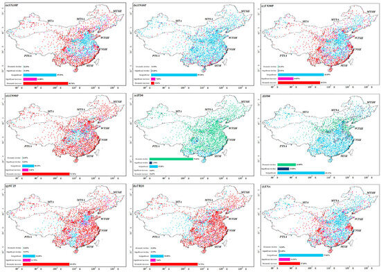 The spatial variation characteristics of the extreme temperature indices in China from 1961 to 2021 were analyzed using the M-K trend test method (as shown in Figure 3). From the spatial distribution map of the relative indices, the percentage of sites with decreasing indices was <1%. The TX10P distribution map shows that 48.74% of the sites had a highly significant upward trend, mainly concentrated in the eastern part of the MTA, southwestern part of the NSH region, and MTH region. The sites with an insignificant trend were concentrated in the south–central part of the WTSH region and north–central part of the NSH region, and the sites with a significant upward trend were distributed in the central parts of the MTSA, MTSH, and NSH region. The TN10P chart shows that 85.36% of the sites had no significant trend, while the sites with extremely significant and significant upward trends were distributed in the southern part of the MTH region and the other seven zones, respectively. The TX90P chart shows that 43.69% of the sites had no significant trends, mainly distributed in the western part of the MTA region, southwestern part of the MTSH region, south–central part of the WTSH region, and north–central part of the NSH region. The sites with a very significant upward trend were mainly concentrated at the NSH edge and in the MTH region, while the sites with a significant upward trend were mainly distributed in the middle parts of the MTS, WTSH, and NSH regions. The TN90P chart shows that 71.76% of the sites showed a significant upward trend, while the sites with an insignificant trend were distributed in the southern part of the WTSH region and northern part of the NSH region. The number of sites with a significant upward trend was half that of sites with an insignificant trend, mainly concentrated in the central areas of the WTSH and NSH regions. From the spatial distribution diagram of the absolute index, the cold indices FD0 and ID0 mainly showed a significant downward trend and an insignificant trend, while the warm indices SU25 and TR20 mainly showed a significant upward trend. As shown in Figure 3e, 79.65% of the sites showed a significant downward trend, mainly distributed in the other six regions except the MTH region, and the sites with an insignificant trend were concentrated in the MTH region. The ID0 chart shows that 61.11% of the sites showed no significant trend and were mainly distributed in the MTA, NSH, and MTH regions. The sites with a significant downward trend were mainly concentrated in the western part of the MTSA region, eastern and western parts of the WTSH region, and eastern part of the SU25 chart; 69.39% of the sites showed a significant upward trend, mainly distributed in the north and south of the WTSH, NSH, and MTH regions. The sites with an insignificant trend were distributed in the central areas of the WTSH, NSH, and MTH regions and east of the PTSA region. The sites with a significant upward trend were distributed throughout the MTSH and WTSH region. According to the TR20 chart, 71.17% of the sites showed a highly significant upward trend, mainly distributed in the eastern part of the WTSH region, central and eastern parts of the NSH region, and MTH region, whereas sites with no significant trends were mainly concentrated in the western part of the NSH region and central and eastern parts of the PTSA region. From the spatial distribution map of the extreme value index, the proportion of sites with a downward trend for each index was the same as that of the relative index, while the growth trends of TXx and TXn were not significant, and TNx and TNn showed highly significant upward trends. As shown by the TXx distribution, 57.02% of the sites showed no significant trend and were mainly distributed in the central areas of the MTSA, MTSH, WTSH, and NSH regions. The sites with a significant upward trend were mainly distributed at the NSH edge and in the MTH region, and the sites with a significant upward trend were distributed in the south of the MTSH and NSH regions. As shown in the TNx chart, 64.91% of the sites showed a significant upward trend, mainly distributed in the PTAS, WTSH, NSH, and MTH regions; the sites with an insignificant trend were mainly distributed in the south–central part of the WTSH region and the north–central part of the NSH region, while the sites with a significant upward trend were scattered in the MTSH, WTSH, and NSH regions. As shown in the TXn chart, 73.78% of the sites had an insignificant trend, mainly distributed in the southern part of the MTSH region, eastern part of the WTSH region, southern part of the NSH region, and MTSA and MTH regions. The sites with significant upward trends were mainly concentrated in the NSH region, and the sites with extremely significant upward trends were mainly distributed at the intersection of the PTSA, NSH, and WTSH regions. As shown in the TNn chart, 53.87% of the sites showed a highly significant upward trend, mainly distributed in the eastern part of the WTSH region and southern parts of the NSH and MTH regions. The sites with an insignificant trend were mainly distributed in the central and western parts of the WTSH region and northeastern part of the NSH region, while the sites with a significant upward trend were distributed throughout the WTSH and NSH regions. From the spatial distribution maps of other indices, WSDI showed an overall significant trend, with sites accounting for as much as 94.83%; the sites with a significant upward trend of GSL were the highest, mainly distributed in the eastern and western parts of the MTSA region, the southwestern part of the MTSH region, and the WTSH region. The sites with an insignificant trend were mainly distributed in the central and southern parts of the NSH and MTH regions. The sites with a significant downward trend in DTR accounted for 59.24%, mainly distributed in the entire MTSH region and the eastern part of the WTSH region, and