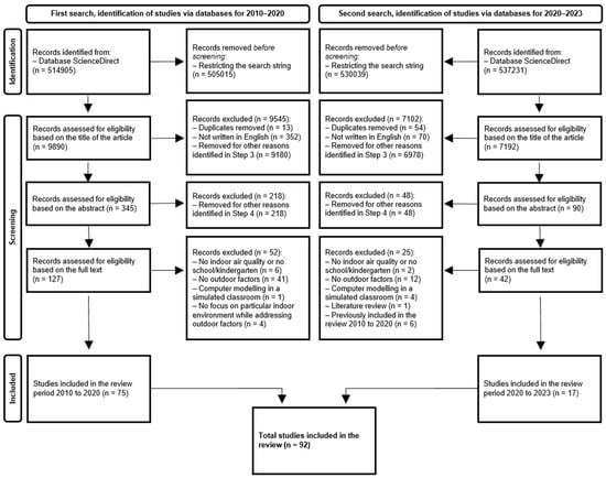 Outdoor factors that affect the IAQ were identified based on a systematic literature review in the ScienceDirect database. The purpose of the literature review was to identify the outdoor factors that affect the IAQ in education settings, which include preschool, primary, and secondary education. The search term used was “IAQ” OR “IAP” OR “indoor air” AND “school” OR “classroom” OR “kindergarten” OR “primary education” AND “risk factors” OR “environmental factors” for the period from 2010 to 2023. The literature search was conducted twice following the same procedure. First, we conducted a systematic literature review in 2020 for the period from 1 January 2010 to 1 December 2020. To obtain the latest available evidence, we conducted another systematic literature review in 2023, where we additionally included studies in the review for the period from 1 January 2020 to 14 December 2023. In a second search, we included the whole year 2020, despite its previous inclusion, as new articles were published at the end of the year that we did not want to miss in our systematic literature review. The literature was selected based on inclusion and exclusion criteria, which were designed according to the purpose of the literature review. The screening of the results of the selected search term was performed in five steps and according to the Preferred Reporting Items for Systematic review and Meta-Analysis (PRISMA) [16]. The first step included all hits for the search string from the selected database, with each following step introducing additional inclusion and exclusion criteria. The inclusion and exclusion criteria for each step are shown in Table 1.