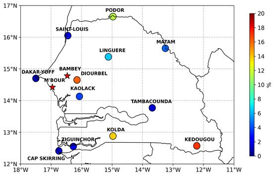 Map of Senegal with 12 synoptic stations from GSOD (Global Surface Summary of the Day). Colors indicate percentage of missing data at stations. Red stars mark the locations of the Sahelian Dust Transect stations: M’Bour (° W, ° N) and Bambey (° W, 14.70° N) (see Section 2.3.2).