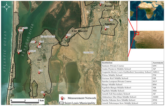 The effects of desert dust episodes were taken into account by combining them with the specific characteristics of the urban context of the Saint-Louis area, such as the heat island effect and urban pollution. The sensors used were PurpleAir PA-II-FLEX (see https://www2.purpleair.com/products/purpleair-flex for more details, accessed on 21 March 2024), installed at 13 colleges and carefully distributed in the area to capture a range of environmental conditions and air pollution levels. These colleges include Abdoulaye Mar Diop Middle School (AMD), Samba Ndieme Sow Middle School (SNS), and Ameth Fall Secondary School (AF) located on the island. In Sor, there are Ameth Telemaque Sow Middle School (ATS), Andre Peytavin Middle School (AP), and Sankore Private Course (SPC). Towards the Pikine zone, we have Pikine Middle School (PM), Guinaw Rail Middle School (GR), and Augustin Henry Louis Guillabert Secondary School (AHLG). Finally, Ngallele Middle School (NM), Ngallele-Bango Middle School (NB), Bango Middle School (BM), and Samba Lampsar Private Course (SLP) complete the list (see Figure 2). Data were collected over the period 2021–2022. The GR and SLP data were ultimately not utilized due to a high percentage of missing data.
