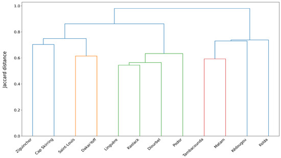 The dendrogram presented in Figure 3 illustrates the clustering of stations, indicating that Senegal can be divided into three homogeneous zones, each comprising four stations: Zone 1 (Saint-Louis, Dakar-Yoff, Ziguinchor, Cap Skirring) represents the coastal region, Zone 2 (Podor, Linguère, Diourbel, Kaolack) is classified as the intermediate zone, and Zone 3 (Matam, Tambacounda, Kédougou, Kolda) corresponds to the inland region. These findings are consistent with those of [52], who regionalized daily heat extremes in Senegal.