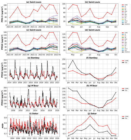 Comparison of PM2.5 and PM10 concentrations (μg/m3) between CAMS (represented by the red curve) and PurpleAir observations (shown in different colors, with Ensemble Mean ENSMEAN in black) in Saint-Louis (a–d); CAMS PM10 with INDAAF observations (Obs) in Bambey and M’Bour (e–h); and CAMS AOD with AERONET observations in Dakar (i,j).