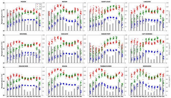 The results indicate that the continental stations exhibit an annual temperature distribution with two peaks in Tx: a main peak in the spring (March–April–May) and a secondary, weaker peak in the fall (October–November). Coastal stations (Dakar-Yoff, Saint-Louis, and Cap Skirring) present a different temperature pattern. At Dakar-Yoff, maximum temperatures are particularly high between May and November, with a peak recorded in October. In the Sahel (e.g., Bamako and Niamey), both southwesterly and northeasterly winds occur with roughly equal annual frequency [75,76,77]. However, Dakar-Yoff is an exception, with northerly winds dominating. On the west coast, the Intertropical Convergence Zone (ITCZ) curves towards the equator, and Dakar-Yoff is rarely located on its equatorial flank. As a result, Dakar-Yoff is influenced by the North Atlantic trade wind system throughout the year. At Saint-Louis and Cap Skirring, a first peak in Tx occurs in March, followed by a second peak in November. For the continental stations in Senegal, Tx values are generally low between December and February, then increase rapidly between March and May. The onset of the rainy season leads to a drop in temperatures, which rise again after the rainy season ends.