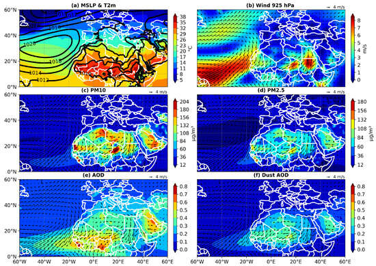 Climatology of MSLP (contours) and T2m (colors) fields from CAMS for March–April–May over the period 2003–2022 (a); wind speed at 925 hPa is shown in color and direction in arrows (b); the climatology of PM10, PM2.5, AOD, and Dust AOD fields (contours) and wind direction (in arrows) for the same period and season are shown in (c), (d), (e), and (f), respectively.
