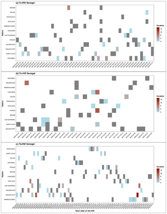 Evolution of Tx-HW (a), Tn-HW (b), and Ta-HW (c) in Senegal between 2003 and 2022. The horizontal axis shows the start dates of each HW, while the vertical axis represents the different synoptic stations. The color of each bar reflects the duration of the HW in days, with darker shades of red indicating longer periods and lighter shades of blue indicating shorter events.