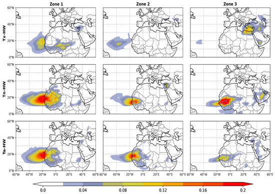 Figure S3, presented in the Supplementary Materials, illustrates the distinct characteristics of HWs across the three zones of Senegal (Zone 1, Zone 2, and Zone 3). This analysis highlights the differences in HW frequency and duration. For Tx-HW, the most common events lasted between 3 and 5 days in all zones. Although simultaneous HW occurrences across stations have been recorded, it is rare to observe them happening concurrently at all three stations. For instance, the HW events of 9 March 2013 and 20 April 2016 in Zone 2 affected three stations, each with an average duration of 4 days. Zone 3 has witnessed an increase in HW frequency since 2010, unlike Zones 1 and 2, which exhibited more interannual variability. However, no significant trend toward an increasing HW duration is observed. In Zone 1, the stations of Saint-Louis and Dakar-Yoff experienced the highest number of HW events, while the southern stations of Ziguinchor and Cap Skirring had fewer occurrences. In Zone 2, Podor and Diourbel registered more events compared to Kaolack and Linguère. In Zone 3, HW events were more evenly distributed across the stations. Overall, Zones 1 and 2 recorded more Tx-HW events (32 and 24, respectively) than Zone 3 (10 events). The results also showed that Tn-HW events, lasting between 3 and 5 days, were common, similar to Tx-HW. A notable event in Zone 1 occurred on 26 May 2005, affecting Dakar-Yoff, Cap Skirring, and Saint-Louis, with an average duration of 4 days. Several other HW events occurred simultaneously, particularly in 2005 and 2012. Across all zones, Ta-HW events tended to last longer than both Tx-HW and Tn-HW, with an average duration of 6 days. Zone 1 registered the highest number of Ta-HW events (31), followed by Zone 3 (27) and Zone 2 (25). Notably, Zone 3 experienced more Ta-HW events (27) than Tx-HW (10) and Tn-HW (13). Table 1 summarizes the number of HW events detected across the three zones of Senegal.