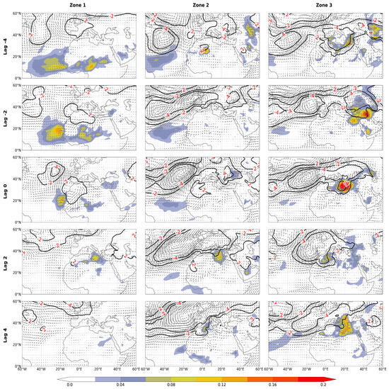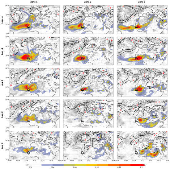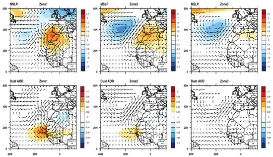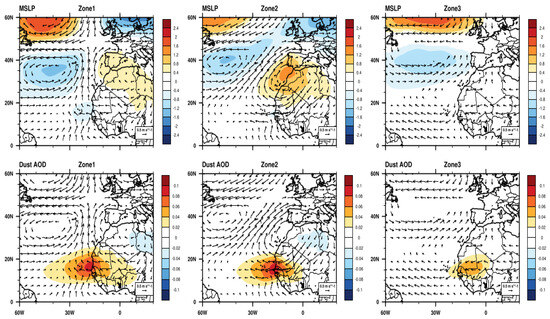 Although the links between HWs and dust have been studied on a regional scale in the Sahel, no specific study addressing this issue in Senegal has been published to date. However, recent research on HWs has indicated that Senegal exhibits unique characteristics compared to the rest of the Sahel, largely due to its location as the westernmost point of Africa [52]. Sambou et al. [52] identified three key findings that are particularly relevant for understanding the role of dust content modulation: (i) Unlike HWs in the central Sahel, the primary pattern controlling HWs in Senegal is characterized by positive pressure anomalies centered around the Strait of Gibraltar, which promote easterly to northeasterly wind anomalies. (ii) Senegal can be divided into three homogeneous zones (Zone 1, Zone 2, and Zone 3), each comprising four stations from west (Atlantic coastline) to east (inland Senegal). In these zones, temperature and moisture patterns shift eastward, while pressure anomalies decrease significantly. (iii) There is a notable difference between night-time HWs (linked to minimum temperatures) and daytime HWs (linked to maximum temperatures). Night-time HWs were found to be associated with higher water vapor content than daytime HWs, corroborating and expanding upon previous findings over the Sahel.