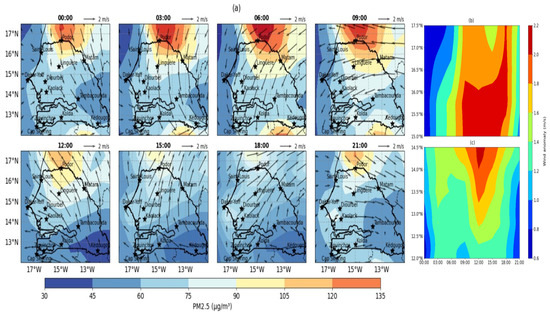 The difference in the timing of the peaks between PM2.5 and Dust AOD can be explained by the distinct origins of these particles. Dust AOD is primarily influenced by desert dust lifting events, which occur under the influence of Harmattan winds, typically being more active at the beginning and end of the dry season. In contrast, PM2.5 is largely a result of anthropogenic sources, such as biomass burning, bushfires, and urban activities, which tend to increase in January and February, when drought conditions are more pronounced and local accumulation of fine particles is favored. The simultaneous minimum levels observed during the rainy season for both types of particles can be attributed to the atmospheric washing effect caused by rainfall, which significantly reduces airborne particle concentrations. Regarding PM10, as presented in the Supplementary Materials (Figure S2), a trend similar to that of PM2.5 is observed, with maximum concentrations during the dry season. These results are consistent with previous studies indicating that fine particulate levels are highest during the dry season and lowest during the rainy season, due to both local and regional pollution sources as well as natural contributions, such as Saharan dust [47,59,64].