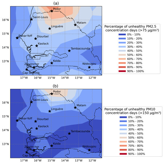 To assess exposure to fine particulate matter during the spring season from 2003 to 2022, we used daily PM2.5 and PM10 data from the CAMS reanalysis data set for Senegal. The air quality thresholds set by the Senegalese standard (NS 05-062, 2019)—which are 75 μg/m3 for PM2.5 and 150 μg/m3 for PM10—were applied. These thresholds are significantly higher than the WHO recommendations, which suggest limits of 25 μg/m3 for PM2.5 and 50 μg/m3 for PM10 [63]. For each grid point, days with PM2.5 and PM10 concentrations exceeding these thresholds were classified as “unhealthy days”. The percentage of unhealthy days for each grid point was calculated by dividing the number of unhealthy days by the total number of days in the spring and then multiplying the result by 100. These percentages were spatially interpolated to generate continuous maps illustrating the spatial distribution of PM exposure across Senegal.