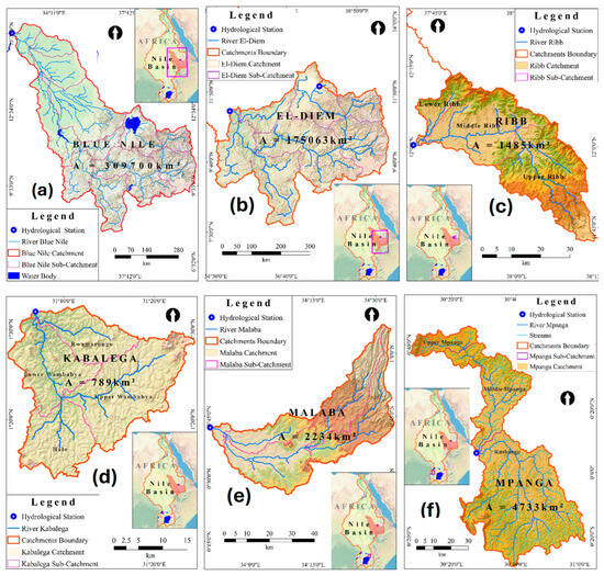 Study area catchments, including (a) Blue Nile, (b) El Diem, (c) Ribb, (d) Kabalega, (e) Malaba, and (f) Mpanga. The blue dots in each panel indicate the location of the hydrological gauge station at the streamflow outlet of the catchment.