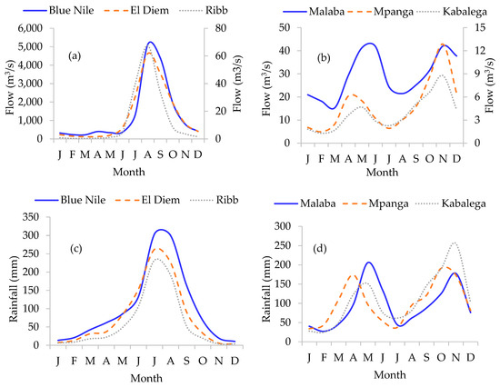 Monthly pattern of (a,b) flow and (c,d) rainfall in the study for the catchments in the (b) Blue Nile and (b,d) White Nile regions.