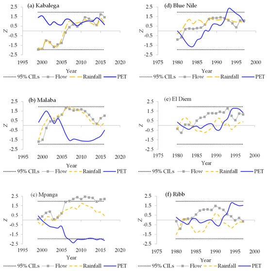 Variability in hydroclimate of (a) Kabalega, (b) Malaba, (c) Mpanga, (d) Blue Nile, (e) El Diem, and (f) Ribb.