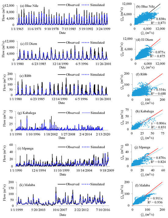 Simulated versus observed streamflows of (a,b) Blue Nile, (c,d) El Diem, (e,f) Ribb, (g,h) Kabalega, (i,j) Mpanga, and (k,l) Malaba.