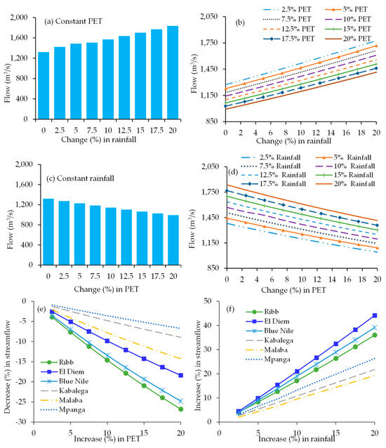 For a given PET rate, the amounts by which streamflow decreased in Kabalega, Malaba, and MPanga (catchments in the White Nile region) were less negative than those from the central area of the Nile basin, including the Blue Nile, El Diem, and Ribb (Figure 5e). This suggested that the catchments in the central region were more sensitive to the changes in PET rates than those from the White Nile region. When the original PET data were kept unchanged while the initial rainfall series was increased by 2.5, 5.0, 7.5, 10.0, 12.5, 15, 17.5, and 20%, the daily Blue Nile streamflow increased by 7.8, 12.6, 14.1, 19.0, 23.9, 28.9, 34.0, and 39.1%, respectively. When rainfall was kept constant while PET was increased by 5%, the streamflows of the Blue Nile, El Diem, Kabalega, Malaba, Mpanga, and Ribb decreased by 7.00, 5.08, 2.49, 4.10, 1.84, and 7.67%, respectively (Figure 5e). By keeping the original rainfall data unchanged while increasing the initial PET series by 2.5, 5.0, 7.5, 10.0, 12.5, 15, 17.5, and 20%, the daily streamflow of the Blue Nile decreased by 3.6, 7.0, 10.3, 13.4, 16.5, 19.3, 22.1, and 24.8%, respectively. Under constant PET, increasing rainfall of the Blue Nile, El Diem, Kabalega, Malaba, Mpanga, and Ribb by 5% led to an increase in streamflow by 9.02, 9.87, 5.38, 4.34, 6.58, and 8.32%, respectively (Figure 5f). Notably, increasing the rainfall intensity under constant PET rate, the catchments in the White Nile basin yielded response lines that were below those for the catchments in the central area of the Nile basin. Again, this shows that the sensitivity of the catchments in the Blue Nile area to increasing rainfall intensity was, for the selected period, higher than that for the White Nile region.