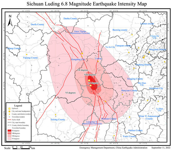 Earthquake location on 5 September 2022 source: “https://www.mem.gov.cn/xw/yjglbgzdt/202209/t20220911_422190.shtml (accessed on 20 September 2022)”.