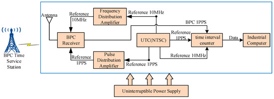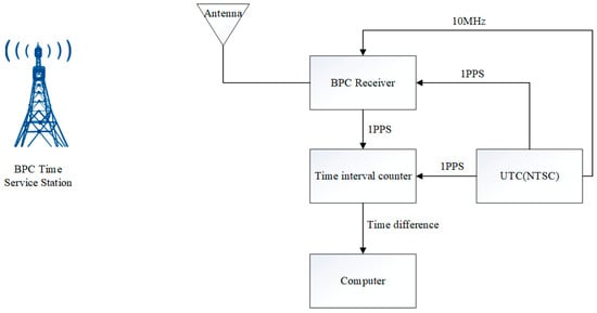 Timing deviation refers to the time deviation between the received and decoded 1 PPS signal at the test point and the standard 1 PPS. The falling edge of the BPC pulse width modulation signal marks the second of the BPC, corresponding to the second of UTC (NTSC). The deviation between the 1 PPS output from the BPC receiver and the UTC (NTSC) 1 PPS, measured by a time interval counter, reflects the propagation path condition of the BPC. The time and frequency source used by the entire system is provided by the UTC (NTSC) maintained by the National Time Service Center of the Chinese Academy of Sciences, providing a 10 MHz frequency signal and standard 1 PPS to the BPC receiver and time interval counter. The BPC receiver outputs the BPC 1 PPS to the time interval counter for phase comparison with the UTC (NTSC) 1 PPS, obtaining the BPC timing deviation result, and then outputs it to the data-acquisition computer for storage. The test process is shown in Figure 2.