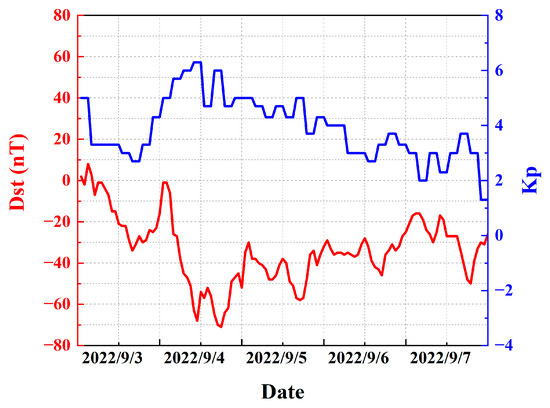 Trend of DST and Kpindex over 5 days “https://omniweb.gsfc.nasa.gov/form/dx1.html (accessed on 3 May 2023)”.