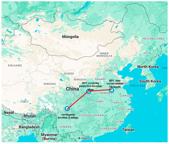Location of BPC time service station, BPC receiving point (Test location), and earthquake location.