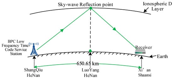 China’s Low-Frequency Time Code timing station is located in Shangqiu City, Henan Province, and it was put into use in 2007. The broadcast frequency of the Low-Frequency Time Code timing station is 68.5 kHz, and the pulse width amplitude modulation mode is used to modulate the time code in the carrier for transmission. The Low-Frequency Time Code timing signal is mainly transmitted through the sky wave and the ground wave. The ground wave mainly propagates along the Earth’s surface and is affected by the propagation path, such as relative dielectric constant, earth conductivity, terrain, and transceiver distance. The sky wave is mainly transmitted through the ionosphere reflection. Because the ionosphere has good conductivity, the signal is transmitted through the ionosphere through one reflection or multiple reflections.