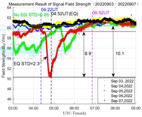 As shown in Table 4, an earthquake occurred on 5 September 2022. The maximum and minimum field strengths were 61.87 dBµV/m and 50.29 dBµV/m, respectively, with a difference of 11.58 dBµV/m. Compared to the other 4 days, the field strength fluctuated significantly with a standard deviation of 2.329, indicating that the ionosphere was unstable during the earthquake. Interestingly, on 4 September, 1 day before the earthquake, the field strength also showed some degree of fluctuation, which will be further analyzed below. The field strength on 3, 6, and 7 September showed consistent trends and fluctuation ranges, which align with typical data patterns.