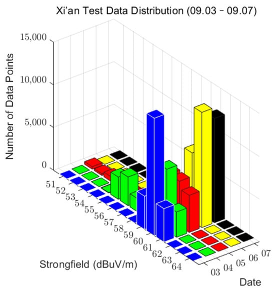 The 5-day field strength curve is shown in Figure 8, where the black-dashed line on the vertical horizontal axis indicates that the earthquake occurred at 04:52 UTC on 5 September 2022. Half an hour before the earthquake, the field strength began to show a downward trend. The signal field strength reached its lowest point around the time of the earthquake and then began to recover, returning to normal levels about 2 h later. The black solid line on the parallel horizontal axis in the figure is the lowest value of the field strength at the time of the earthquake, the red solid line is the average value of the field strength on 5 September, and the green solid line is the average value of the field strength at the remaining 4 days. Through statistical calculation, the lowest field strength at the time of the earthquake decreased by 8.9 dBμV/m compared with the average value on 5 September. This is about 10.1 dBμV/m lower than the average for the remaining 4 days. The STD value of the field strength data on the earthquake day is 2.3, and the STD value of the other 4 days is 0.85, which obviously shows the biggest fluctuation on the earthquake day. The distribution map of field strength values is shown in Figure 9. The field strength distribution of the 68.5 kHz BPC timing signal from 3–7 September 2022 are listed in Table 4.