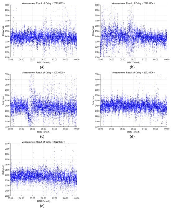 (a–e) Five charts for 3–7 September 2022, the measurement results of Low-Frequency Time Code timing deviation.