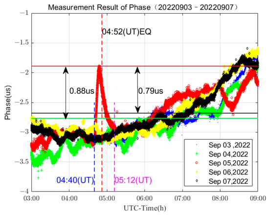 From Table 7, it can be seen that the phase on 5 September experienced significant fluctuations during the aforementioned period. The standard deviation reached 0.267 μs, and the difference between the maximum and minimum values was 1.35 μs. This represents a considerable anomaly compared to the relatively stable phase observed in the other 4 days, strongly suggesting that the earthquake induced disturbances in the ionosphere.