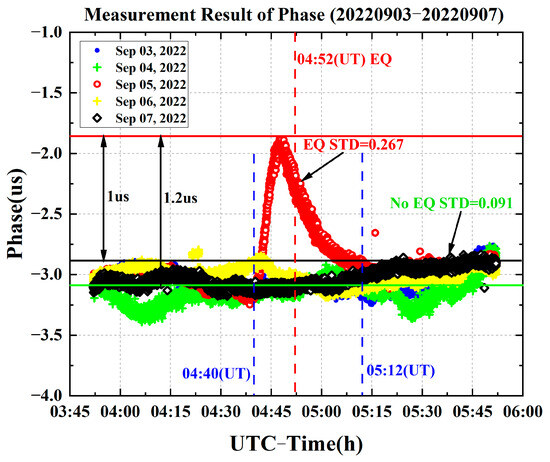 Since the statistical time is 6 h, the abnormal period is relatively short, and the difference between mean and standard deviation is not significant. Figure 12 shows a statistical analysis of 2 h of phase data from 03:52 (UTC) to 05:52 (UTC). The difference between mean and standard deviation is obvious. By calculating STD = 0.267 on the earthquake day, and the average STD of the remaining 4 days is 0.091, the red horizontal line in the figure represents the maximum phase value of the earthquake moment is −1.89 μs and the black horizontal line represents the average value of the earthquake day during this period of time is −2.89 μs. The difference between the two is 1 μs. The green horizontal line represents a phase average of −3.09 μs for 4 days without an earthquake, which is 1.2 μs away from the peak.