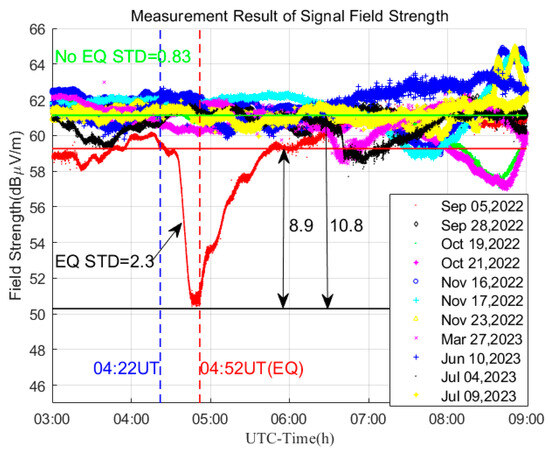It can be seen from the geomagnetic data in Table 2 that 10 days of relatively quiet geomagnetic activity were selected. The daily field strength data of the earthquake during the same time period on 5 September were statistically compared, as shown in Figure 13. In Figure 13, the red curve represents the trend of field strength change on the earthquake day, and the other colors represent the trend of field strength change on the 10th day when the geomagnetic activity is quiet. The black solid line on the parallel horizontal axis represents the lowest point of field strength at the time of the earthquake is 50.29 dBμV/m; the red straight line represents the average value of field strength on the day of the earthquake, and the decrease at the time of the earthquake is about 8.9 dBμV/m; the green horizontal line in the figure represents the average value of the field strength during the 10 days of quiet geomagnetic activity, and the difference between the field strength and the lowest point of the earthquake is about 10.8 dBμV/m. It can be seen that the average value of the seismic day is about 1.9 dBμV/m lower than the average value of the other 10 days, and the STD value of the field strength data is 2.3 on the earthquake day and 0.83 on the other 10 days. It can be found that on the days of no geomagnetic activity, the trend on 3 September, 6 September, and 7 September was basically the same, and the BPC signal field strength did not suddenly drop. Taken together, the anomaly in the 5 September signal rules out the possibility of a geomagnetic storm.