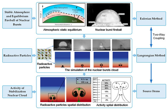 The flowchart in Figure 1 illustrates the methodology of this paper. Initially, the numerical model of the fluid phase of the nuclear cloud is established within the Eulerian framework. Subsequently, the numerical equation for the stable atmosphere is proposed based on a static equilibrium model, and the initial parameters for the nuclear fireball are obtained from the DELFIC-Initialization module. Following this, a trajectory tracking model for radioactive particles is developed within a Lagrangian framework, taking into account two-way coupling to simulate the behavior of radioactive particle-laden clouds. The rise time sequence of the nuclear cloud is then validated against historical test data to ensure the model’s reliability. Finally, activity-height distributions of the stabilization cloud are derived from number-size and activity-size distributions used in our numerical modeling framework.