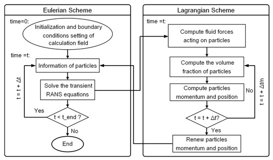 Furthermore, the impact of particle–particle interaction has been disregarded due to the primary focus on the transport and diffusion of radioactive particles, which is the influence of fluid on particles [17]. The flowchart illustrating the Eulerian–Lagrangian algorithm is presented in Figure 2, with the basic process outlined as follows: