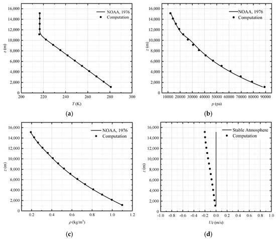 The pressure-based solver is utilized with the Eulerian model to simulate the fluid phase of atmospheric flow field, which is initialized with a stable atmosphere stratification under the assumption of atmospheric static equilibrium. The time-averaged numerical atmospheric parameters (the first 500 s) are compared with the U.S. standard atmosphere to validate the ability of this numerical model in handling atmospheric stratification. The numerical simulation error statistics are presented in Figure 3, and it is observed that the numerical solutions of the stable atmosphere demonstrate good performance of atmospheric parameters consistent with the U.S. standard atmosphere of 1976.