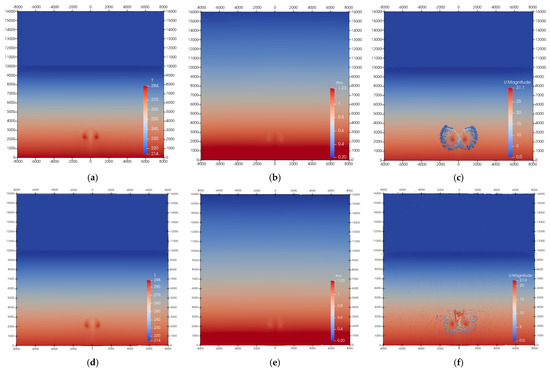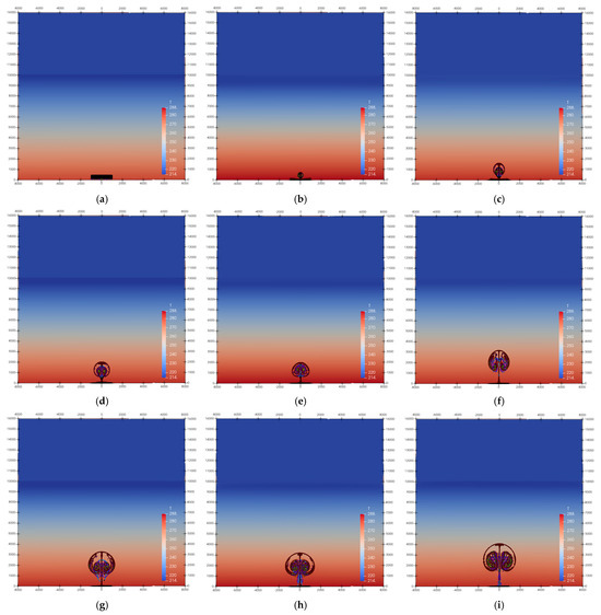 In this case, the computational resolution of the fluid phase and discrete particles is conducted in a pseudo two-dimensional geometry measuring 16 × 16 × 0.05 km (X × Z × Y), with a mesh consisting of 320 × 320 × 1 cells. The boundary conditions for the atmospheric boundaries are set as type patch for the side faces (Y-Z) and top face (X-Y), while the front and back faces (X-Z) are designated as type axisymmetric to simulate the three-dimensional cloud within a pseudo two-dimensional framework. The initialization of the atmosphere in Section 2.4.1 (Dirichlet boundary condition) dictates that the fluid field be patched accordingly, with the bottom face (X-Y) representing ground surface being set as type wall with zero-gradient pressure and no-slip shear boundary conditions (Robin boundary condition). The geometry and boundary conditions of this case are shown in Figure S3 from the Supplementary Materials.