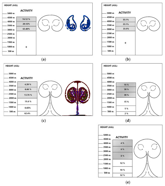 The total activity distribution in each vertical layer of a stabilization cloud: (a) Distribution of the simulation of the RANGER-Able test; (b) Activity distribution of air bursts of the AFPT; (c) Distribution of the simulation of the BUSTER-JANGLE-Sugar test; (d) Activity distribution of surface or near-surface bursts of the AFPT; (e) Activity distribution of Glasstone and Dolan. (The shaded region represents the layers defining the cloud cap).